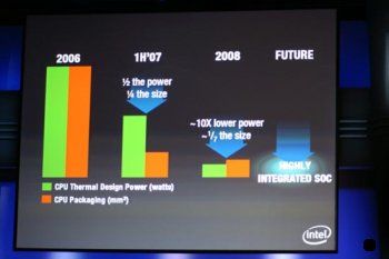 The umpc was on the list of subjects for the first days keynote. Above is the overly generic roadmap for the next few years of device development. Intels objectives at this point are power consumption and physical processor size, both of which should help with a number of problems facing the first generation devices. Also demonstrated was a new device prototype featuring a custom UI and Volkswagon sync capabilities. Nothing to exciting but good to see some progress and plans by one of the bigger players in the game.