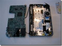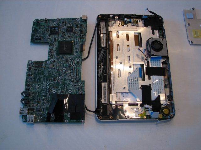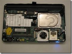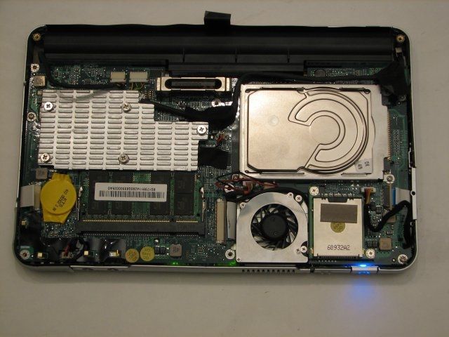General soft-core naked images follow (click to enlarge. phnar! phnar!) starting with a cheeky look at the back-side, this is what you see when you strip the back naked. (OK i’ll stop now!) From here you can access the memory and HDD. The CPU is covered by the heatsink. This images was taken after I managed to put it all back together again. You can see the power-light on. That made me happy.