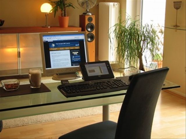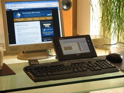 In the meantime, I’m pretty happy with my new office setup. The ultra mobile PC makes a really tidy dual-screen PC with a monitor and keyboard.