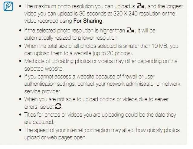 Image1So, to recap, the Bluetooth function is near useless. The Wifi function is limited and the email service comes with adverts. I briefly tested the DLNA service with my Galaxy Tab and couldn’t get anything to transfer or even show in file lists. 100% of the internet sharing features on this camera have issues. It’s enough for me to say “no. It’s not for me. inch Actually I’m a bit pissed that Samsung don’t come clean about these restrictions. You can find them on Page 102 of the PDF manual which comes on a CDROM with the device!!!  (Image in full article to the right.)