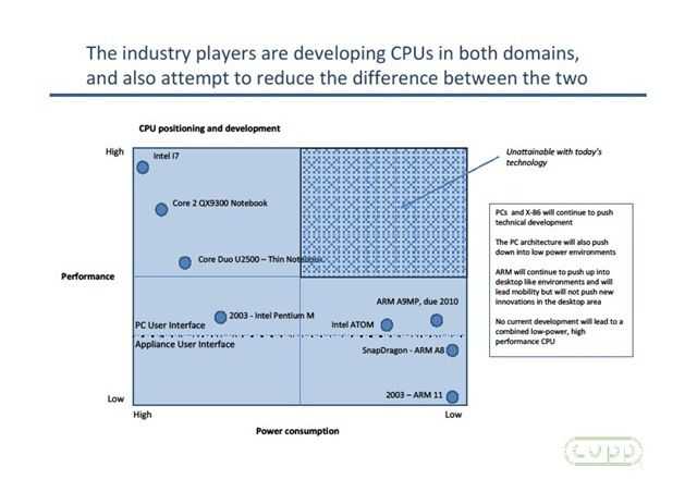 - Question / opportunity: With operating systems becoming processor agnostic (E.g. Windows, Ubuntu, MeeGo, Android) and X86 processors reaching into low-power territory, is virtualisation a more flexible solution? (This solution could work in the future when both desktop and mobile operating systems allow X86 architectures to idle down into RISC territory.) On the other hand, there maybe an advantage here. Imagine Ubuntu or MeeGo running on both ARM and X86 with synchronised switching between the two.