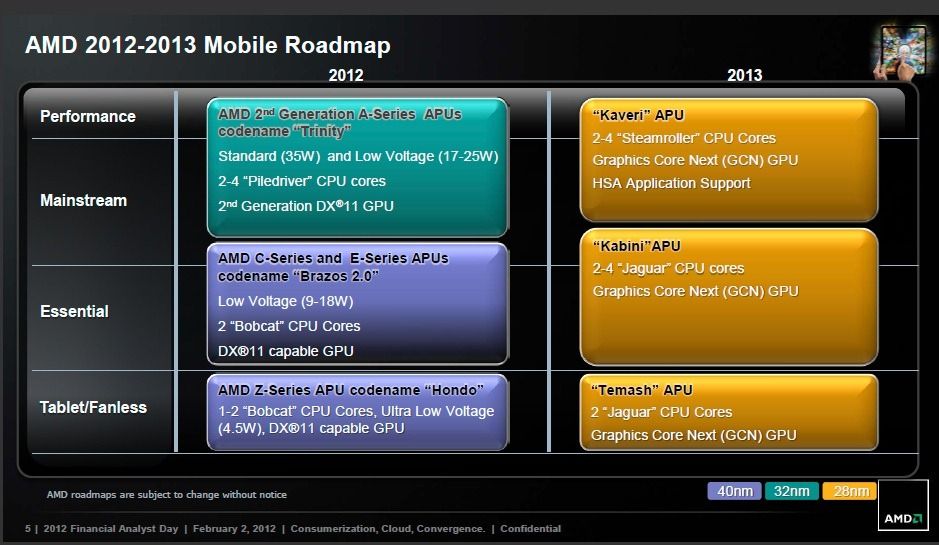 At the AMD financial analysis day a few days ago (FAD) three families of APUs targeting the sub 20W TDP space were announced which means good options and good competition in the mobile computing space and with the low-power ‘Trinity’ application processor unit (APU) an interesting (competitor for Intel + products for us) addition to the thin-and-light market. It’s exciting news and something we’ll be following, and eventually testing, on Ultrabooknews. Here’s my analysis of the facts presented. We’ll be ignoring the AMD C, E and Z series APUS in this article. They are targeted at tablets and low-cost netbook-style devices.