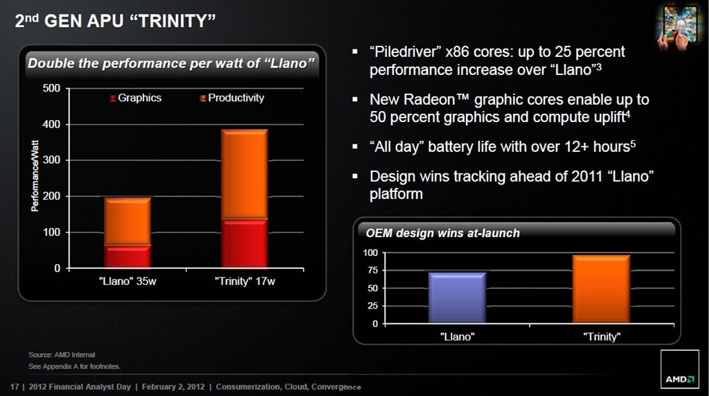 Trinity is the codename for an APU platform based on ‘Piledriver’ CPU cores. There will be an ‘A6 series’ 17W TDP version that will be interesting for the Ultrabook market and AMD is saying that it will offer the same performance as the current ‘Llano’ APUs at 35W. What does that mean?