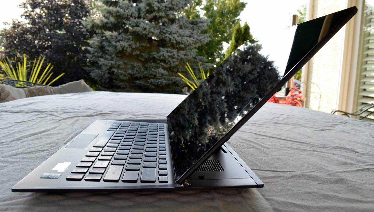 The only downside to this sliding design is that the screen is stuck at one angle and cannot be adjusted. The excellent viewing angles make this mostly a non issue, but there’s something weird about not looking at the screen straight on. The webcam is also aims perfectly perpendicular to the plane of the screen, so unless you have a table of just the right height, you might need to move around to center your head in the camera’s view.