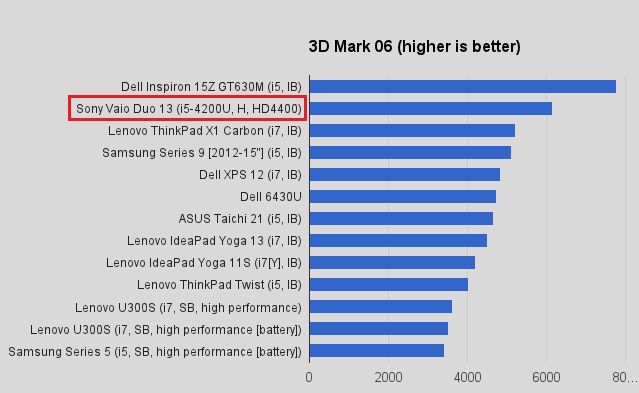 In the graphical benchmarks we ran (3D Mark 06 and Cinebench OpenGL), the Sony Duo 13 performed admirably, with a noticeable jump in GPU power over its Ivy Bridge predecessors (even considering Core i5 vs. i7) in the 3D Mark 06. It isn’t a 2x increase, but it’s definitely an improvement — and in a lower power envelope than prior Ivy Bridge processors (17W vs. 15W) which means you’re getting better performance and more battery savings.