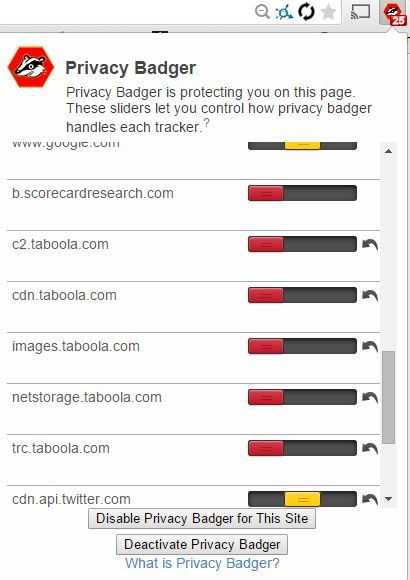 Here’s the Privacy Badger drop-down that clearly indicates the scripts/trackers being used. I’ve set them all to ‘blocked.’