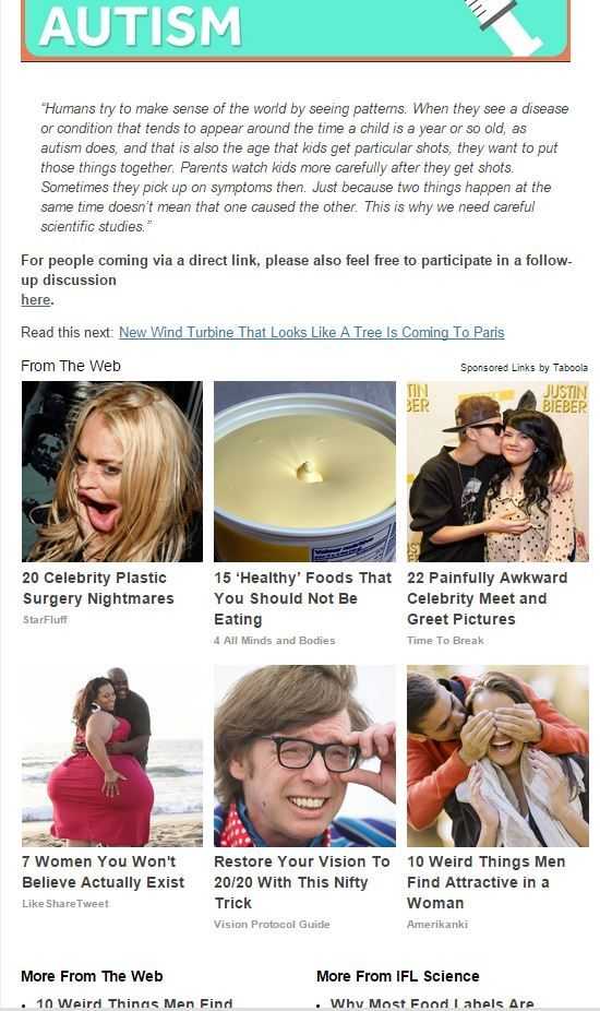 I use the Privacy Badger plugin on Chrome to keep tabs on trackers, auto-block in some cases and to manually block scripts if needed. It’s simple to block Taboola. Here’s an example of a site that used it, before and after applying the Privacy Badger block. More information on how to do this is below.