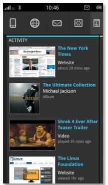 The center column has been dropped from the home zone and filled out with social network tiles. Having used these on Moblin, all I can say is inefficient. 13 status updates on a 1024×600 screen is not an efficient way to use the device for anyone remotely familiar with making friends on the Internet. Let’s hope that the MeeGo UI teams offer an ‘advanced’ front end. Again, it’s not clear if this actually is the UI for release 1.0 though. Update: It is!